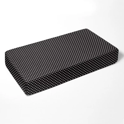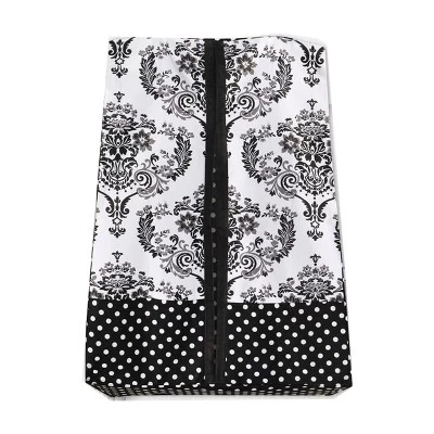 - This Bacati 10-piece Crib Set Includes Reversible Comforter/Playmat (33 x 43 inches), Crib fitted sheet (52 x 28 x 6 inches), Crib Skirt/Dust ruffle (13 inch drop) Diaper Stacker (holds more than 30 newborn diapers), Reversible Long Crib Rail Guard Cover (52 x 12 inches), Window Valance (15 h x 56 w inches with 1.75 inch Rod Pocket), 3 pc Wall Hangings Set and Musical Mobile in fun, colorful and signature prints in 100 percent cotton 200 Thread Count percale fabrics. Designed in United States by Experienced Designers. Many coordinating items available to purchase separately in this Bacati Classic Damask Black/Grey/White Bedding Collection.