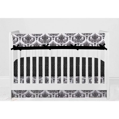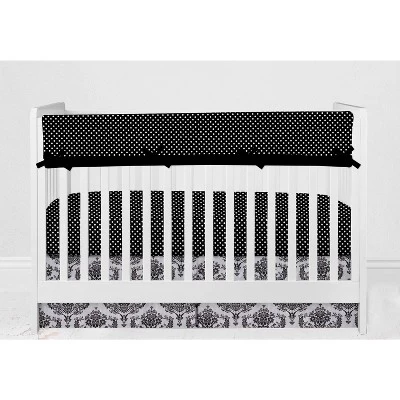 - This Bacati 6-piece Crib Set Includes Reversible Comforter/Playmat (33 x 43 inches), Crib fitted sheet (52 x 28 x 6 inches), Crib Skirt/Dust ruffle (13 inch drop) Diaper Stacker (holds more than 30 newborn diapers), Reversible Long Crib Rail Guard Cover (52 x 12 inches) and Window Valance (15 h x 56 w inches with 1.75 inch Rod Pocket) in fun, colorful and signature prints in 100 percent cotton 200 Thread Count percale fabrics. Designed in United States by Experienced Designers. Many coordinating items available to purchase separately in this Bacati Classic Damask Black/Grey/White Bedding Collection.