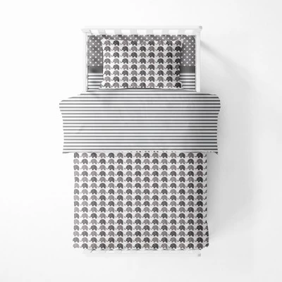 - This Bacati 3-piece Toddler Sheet Set Includes Toddler Bed Fitted Sheet (52 x 28 x 6 inches), Toddler Bed Flat Sheet(52 x 42 inches) which is fitted at the bottom to make the bed easily and Standard Pillow Case (20 x 25 inches) with rench ties on the back in fun, colorful and signature prints in 100 percent cotton 200 Thread Count percale fabrics. Designed in United States by Experienced Designers. Many coordinating items available to purchase separately in this Bacati Elephants White Steel Gray Bedding Collection.