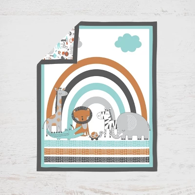 - This Bacati 4-piece Crib Set Includes Reversible Comforter/Playmat (33 x 43 inches), Crib fitted sheet (52 x 28 x 6 inches), Crib Skirt/Dust ruffle (13 inch drop) and Diaper Stacker (holds more than 30 newborn diapers) in fun, colorful and signature prints in 100 percent cotton 200 Thread Count percale fabrics. Designed in United States by Experienced Designers. Many coordinating items available to purchase separately in this Bacati Jungle Safari Aqua Orange Gray Bedding Collection.