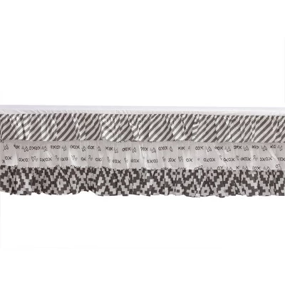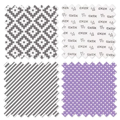 - This Bacati 3-piece Crib Set Includes Reversible Comforter/Playmat (33 x 43 inches), Crib fitted sheet (52 x 28 x 6 inches) and Crib Skirt/Dust ruffle (13 inch drop) in fun, colorful and signature prints in 100 percent cotton 200 Thread Count percale fabrics. Designed in United States by Experienced Designers. Many coordinating items available to purchase separately in this Bacati Love Aztec Gray Lilac Bedding Collection.