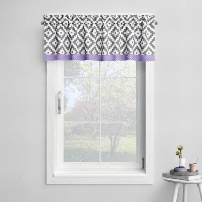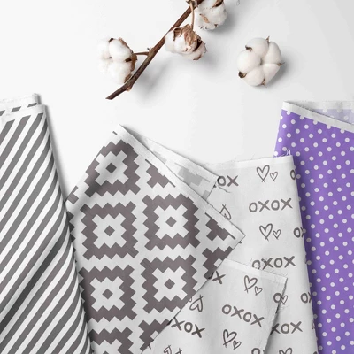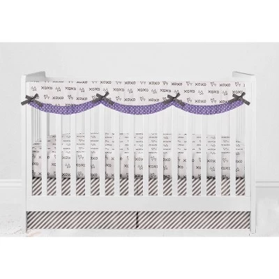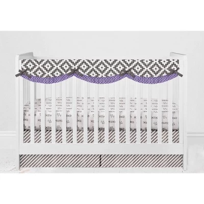 - This Bacati 10-piece Crib Set Includes Reversible Comforter/Playmat (33 x 43 inches), Crib fitted sheet (52 x 28 x 6 inches), Crib Skirt/Dust ruffle (13 inch drop) Diaper Stacker (holds more than 30 newborn diapers), Reversible Long Crib Rail Guard Cover (52 x 12 inches), Window Valance (15 h x 56 w inches with 1.75 inch Rod Pocket), 3 pc Wall Hangings Set and Musical Mobile in fun, colorful and signature prints in 100 percent cotton 200 Thread Count percale fabrics. Designed in United States by Experienced Designers. Many coordinating items available to purchase separately in this Bacati Love Aztec Gray Lilac Bedding Collection.