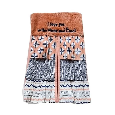 - This Bacati 10-piece Crib Set Includes Reversible Comforter/Playmat (33 x 43 inches), Crib fitted sheet (52 x 28 x 6 inches), Crib Skirt/Dust ruffle (13 inch drop) Diaper Stacker (holds more than 30 newborn diapers), Reversible Long Crib Rail Guard Cover (52 x 12 inches), Window Valance (15 h x 56 w inches with 1.75 inch Rod Pocket), 3 pc Wall Hangings Set and Musical Mobile in fun, colorful and signature prints in 100 percent cotton 200 Thread Count percale fabrics. Designed in United States by Experienced Designers. Many coordinating items available to purchase separately in this Bacati Olivia Coral Navy Bedding Collection.