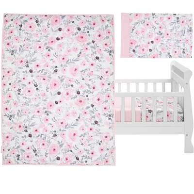 The perfect way for your little one to transition from their crib is into a toddler bed. They share the same size mattress making switching a snap. This toddler bedding set includes one quilt (42” X 57”) one fitted bottom sheet, one top sheet and one standard size pillowcase. A gorgeous floral watercolor print in pinks and grays decorates the quilt, fitted bottom sheet, top sheet, and a standard size pillowcase with a solid pink 3 ½” border. Made in a silky soft microfiber fabric this is sure to please your little toddler. The fitted bottom sheet is 28” X 52” and has elastic all the way around ensuring a safe and snug fit on a standard size crib/toddler mattress. The top sheet is 44” X 61” and the pillowcase is 20” X 31 ½”.
