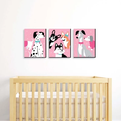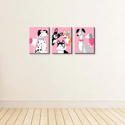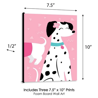 Pawty Like a Puppy Girl Wall Art Set INCLUDES 3 ready-to-hang dog themed panels and non-marking wall mounts for easy hanging. Pawty Like a Puppy Girl artwork is perfect for a nursery, kids room or playroom. Pawty Like a Puppy Girl Wall Art & Kids Room Decor SIZE each 10 inches high x 7.5 inches wide x .5 inches thick. Pink puppy lightweight art prints will arrive ready to use – no frame needed. The black edge gives each print a modern, finished look. EASY TO HANG: Simply attach a non-marking wall mount (included) to each corner of a Pawty Like a Puppy Girl art panel and press to hang in desired location. Wall mounts are repositionable, so you can redesign your artwork display at any time. PREMIUM HOME DECOR: 3-piece Pawty Like a Puppy Girl Wall Art Set is professionally printed on thick material with a black edge. You will not need to frame this set of doggie room decor. Each standout print is ready to hang and will add a contemporary touch to any room. MADE IN THE USA: Pawty Like a Puppy Girl Nursery Wall Art & Kids Room Decor is designed and manufactured at our Wisconsin facility using materials that are Made in the USA.