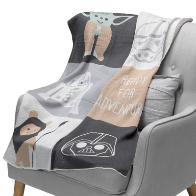 This soft knitted patchwork blanket is made with luxurious acrylic yarns. It features Yoda with his light saber, the helmet of Darth Vader, a gray and white R2-D2, an Ewok holding his pewter spear, a Storm Trooper helmet, and the verbiage “Ready for Adventure”. Your little one will love cuddling in this perfectly sized stroller blanket that is 30” X 40”. It makes a great baby shower gift or welcome home baby gift and is a top baby registry pick.