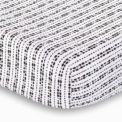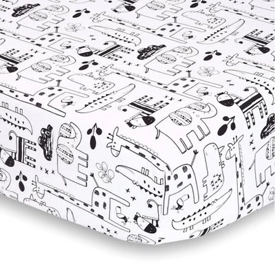 Head out on safari with this geometric themed 2pk crib sheet set from The Peanutshell. Set of two makes for quick and easy changes, with simple machine wash/tumble dry care. One pattern is a mix of your little ones favorite animals, including elephants, giraffes, rhinos and alligators in a cute line-drawn print; the other pattern is our take on a geometric stripe. Colored in modern black on a crisp white ground, these are sure to be the perfect setting for your little one to dream of safari adventures on the open plains.