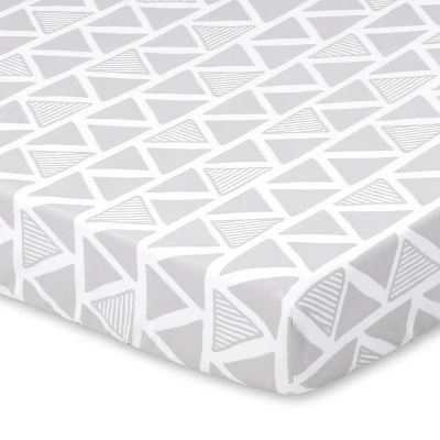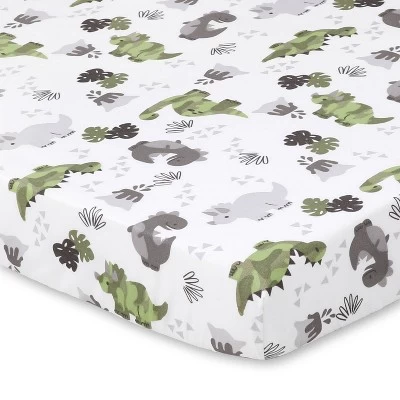 Dinos roam the land in the Dino 2 Pack Playard Sheet set from The Peanutshell. One sheet features dinosaurs in camo in shades of green with a fun background of tossed leaves and geometric shapes on crisp white; the second sheet features a fun geometric print in gray on white. Each sheet is made of soft microfiber – smooth against baby’s delicate skin. All-around elastic for easy fit . With a 2 pack, you always have an extra sheet on hand for quick changes with machine wash/tumble dry easy care. Perfect to send your little one off to sleep!