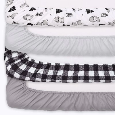 The Peanutshell Woodland Walk 4 Piece Crib Bedding Set fits well in any baby’s room! The quilt has a center panel combining owls, a hedgehog, fox, raccoon, and even a moose created from appliqued fabric and embroidery, bringing these characters to life. The edge of the quilt uses a chevron printed in soft shades of grey and a dark grey inner border for interesting construction details. The same playful characters are found again in the printed sheet, and the same chevron print finishes off this set in the three-sided crib skirt. Shades of grey, greens, and browns make this the perfect color story for any baby boy or girl. Microfiber fabric is touchable soft and the easiest of care. Set includes quilt, fitted sheet, and 3-sided dust ruffle. The Peanutshell Woodland Plaid Musical Mobile completes the collection. Woodland Animals in grey and tawny brown playfully hang from fabric covered arms and little mountain and tree details. Music box is suspended from a fabric covered arm in a fun buffalo plaid fabric. Digital music box plays snippets of 12 lullabies. Two AA batteries required, not included.